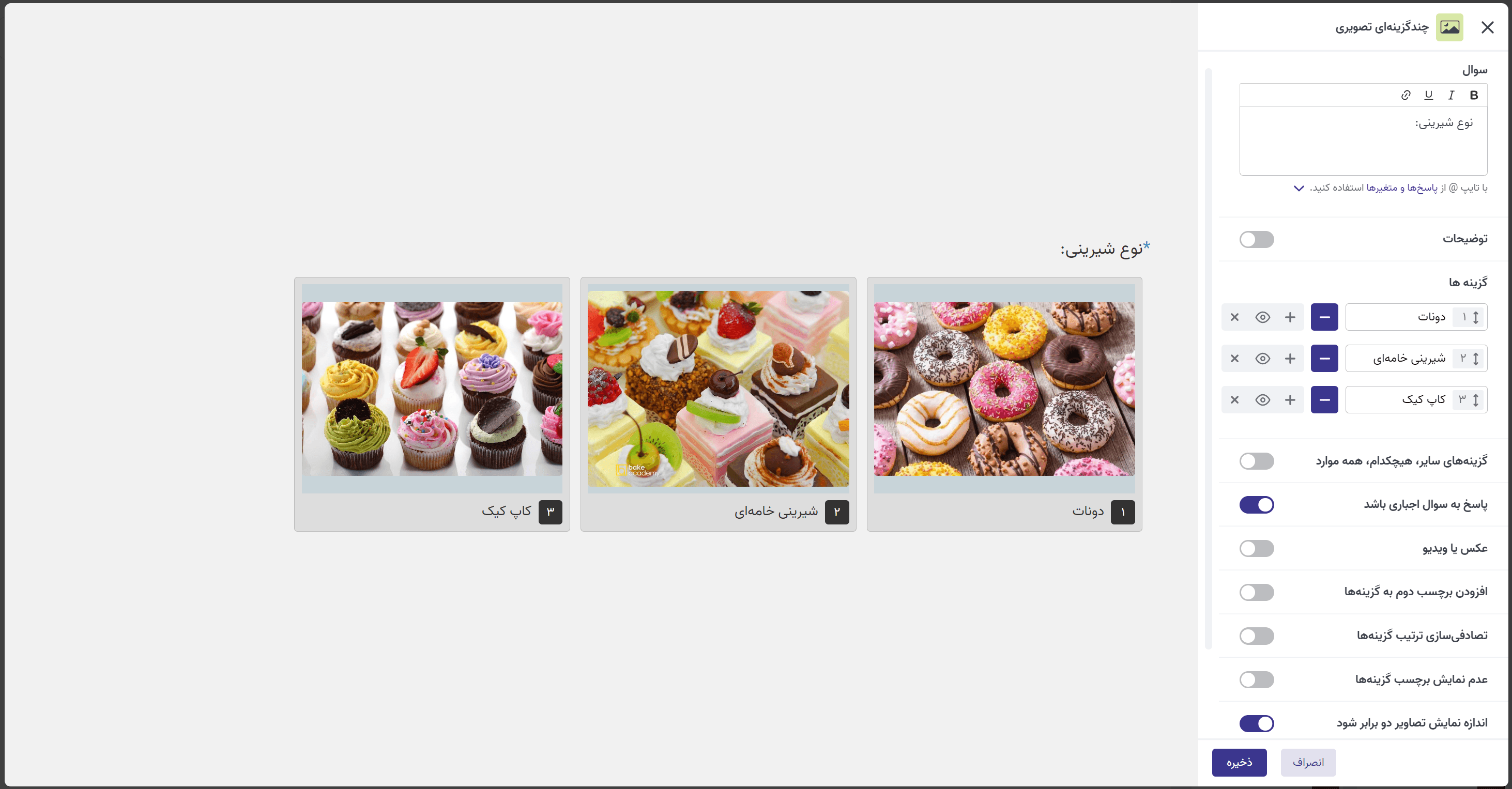 برای پیاده سازی این سناریو پس از ایجاد پرسشنامه جدید، برای نمایش بهتر محصولات میتوانید از نوع سوال چند گزینهای تصویری استفاده و عکس مربوط به هر شیرینی را بارگذاری کنید.برای نمایش بهتر عکسها میتوانید گزینه «اندازه نمایش تصویر دو برابر شود» را فعال کنید تا پاسخدهنده امکان مشاهده بهتر عکسها را داشته باشد.