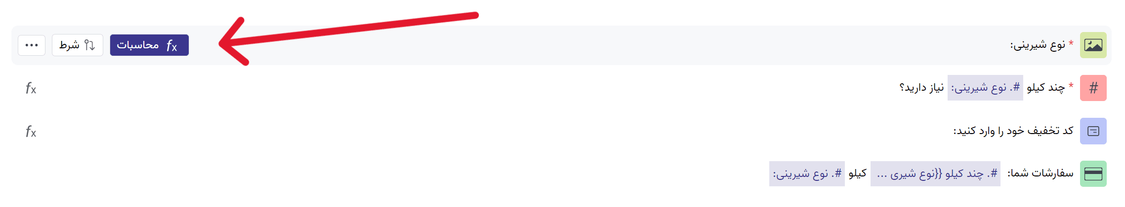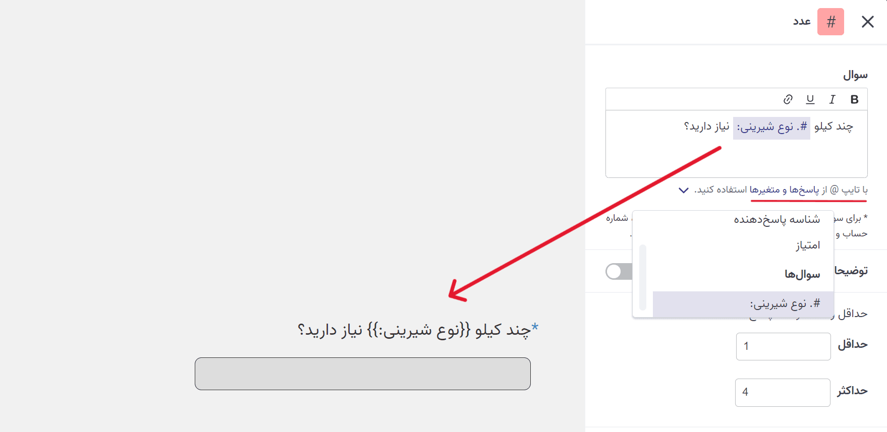 برای دو شیرینی دیگر هم به همین شکل عمل و با کلیک روی افزودن محاسبات، قیمتها را اضافه میکنیم. در مرحله بعد از مشتری خواسته میشود تا مقدار شیرینی مورد نیازش را وارد کند. در این قسمت از نوع سوال عددی استفاده و حداقل و حداکثر را براساس موجودی شیرینی وارد میکنیم. همچنین برای تعامل بیشتر با پاسخدهنده میتوانیم با تایپ @ از پایپ پاسخ و متغیر استفاده کنیم و گزینهای که در مرحله قبل انتخاب کرده را به او نمایش دهیم.