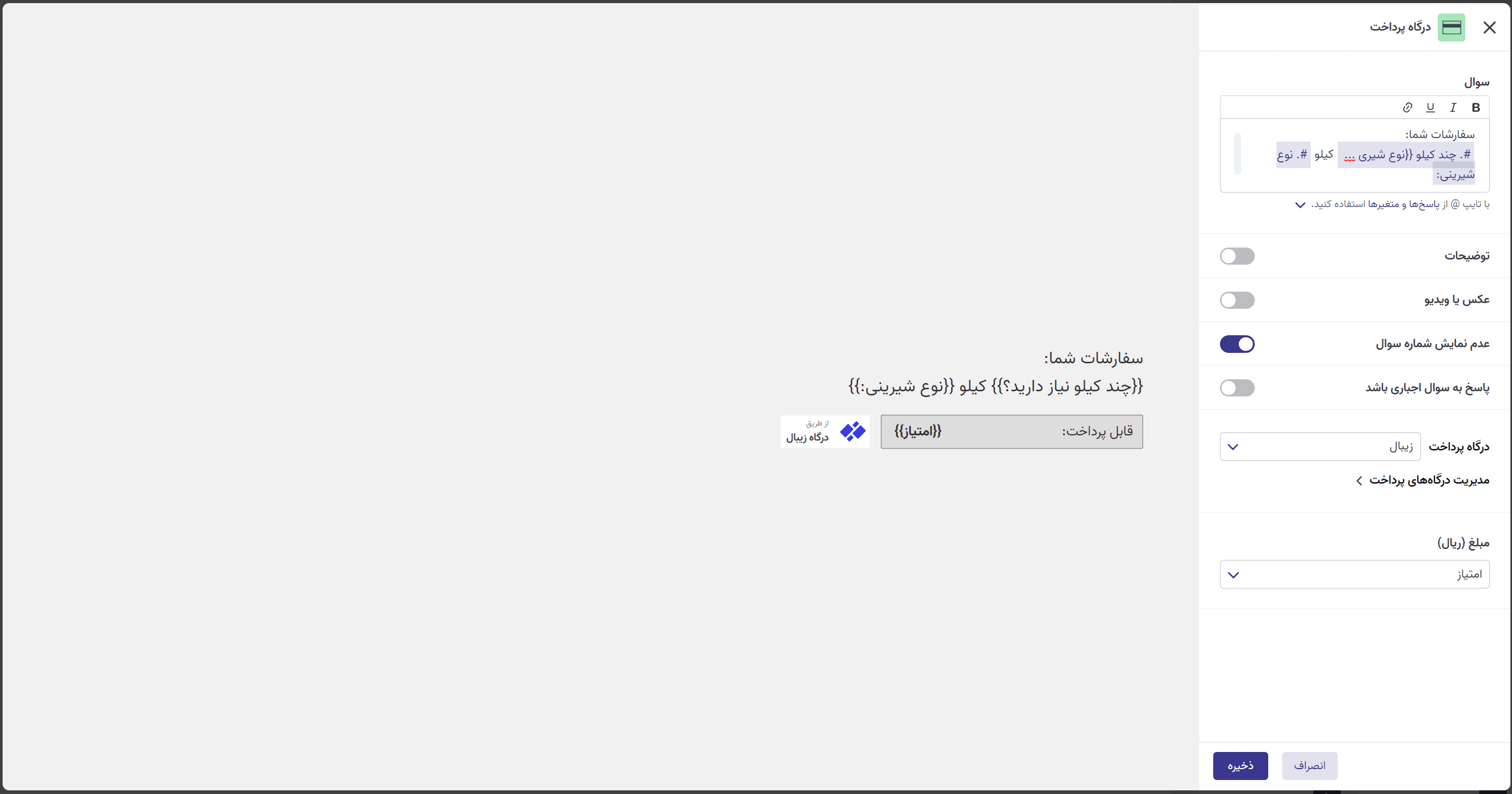 در مرحله آخر از بخش ایجاد نوع سوال پرداخت را انتخاب کرده و پس از افزودن کد درگاه در بخش مدیریت درگاههای پرداخت درگاه زرینپال و یا زیبال خود را فعال میکنیم. سپس در فیلد مبلغ، محاسبه را برحسب متغیر امتیاز انتخاب کرده و در قسمت عنوان با پایپ پاسخ و متغیر سفارش مشتری را به او نمایش میدهیم. به غیر از محاسبه مبلغ با استفاده از متغیرها، بسته به سناریو مورد نظر خود، میتوانید یک مبلغ ثابت را در فیلد مبلغ وارد کنید.