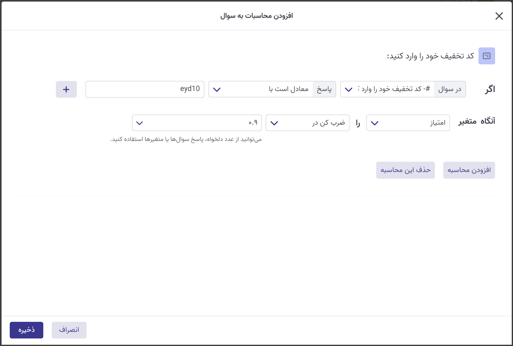 اگر برای مشتریان خود کد تخفیف ارسال کردهاید با انجام این چند مرحله میتوانید ضمن دریافت کد، با اعمال آن از مبلغ کل مشتری کسر کنید. برای این کار ابتدا کافی است یک سوال متنی با پاسخ کوتاه ایجادکنید. سپس در قسمت محاسبات، تعریف کنید برای مثال اگر مشتری کد «eyd10» را وارد کرد مبلغ ۱۰۰،۰۰۰ ریال از متغیر امتیاز کم شود.