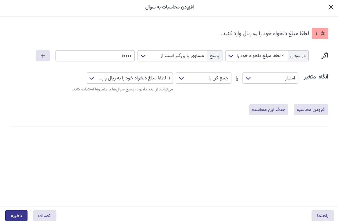 اگر مایل هستید در فرمی که ایجاد کردهاید پاسخدهنده امکان پرداخت مبلغ دلخواه را داشته باشد کافیست مبلغ نوع سوال پرداخت را بر اساس متغیر امتیاز انتخاب کنید و سپس با ایجاد یک نوع سوال عدد محاسبات زیر را تعریف کنید. در اینجا ما حداقل مبلغ قایل پرداخت را ده هزار ریال درنظر گرفتهایم.