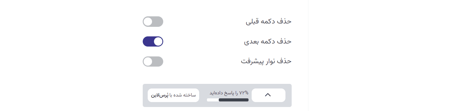 برای اینکه پاسخدهندهها را قبل از تکمیل فرم ملزم به پرداخت هزینه کنید، تنها کافی است در پرسشنامه مربوطه از فاز تنظیمات، بخش تنظیمات عمومی، حذف دکمه بعدی را فعال کنید تا تنها در صورتی که پرداخت موفقیتآمیز بود امکان تکمیل فرم وجود داشته باشد.