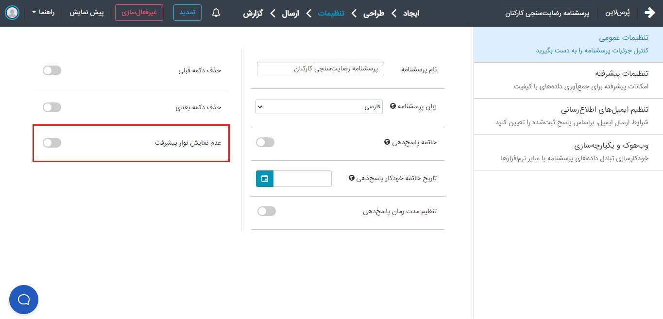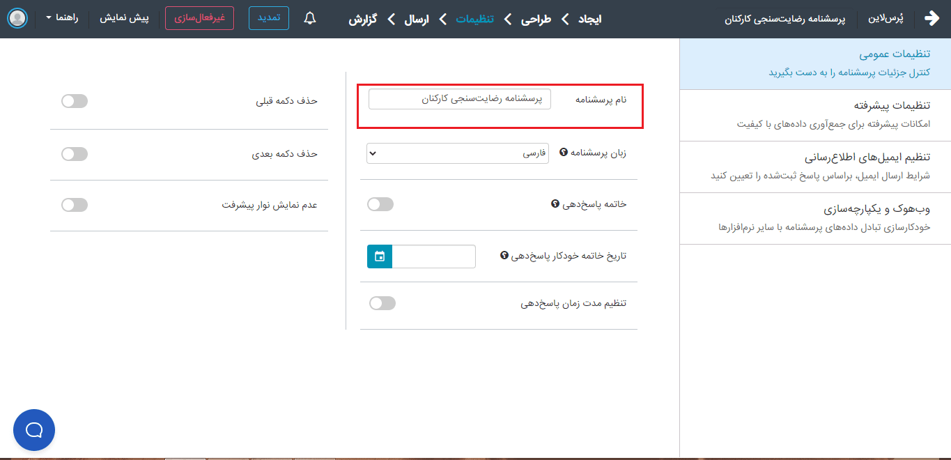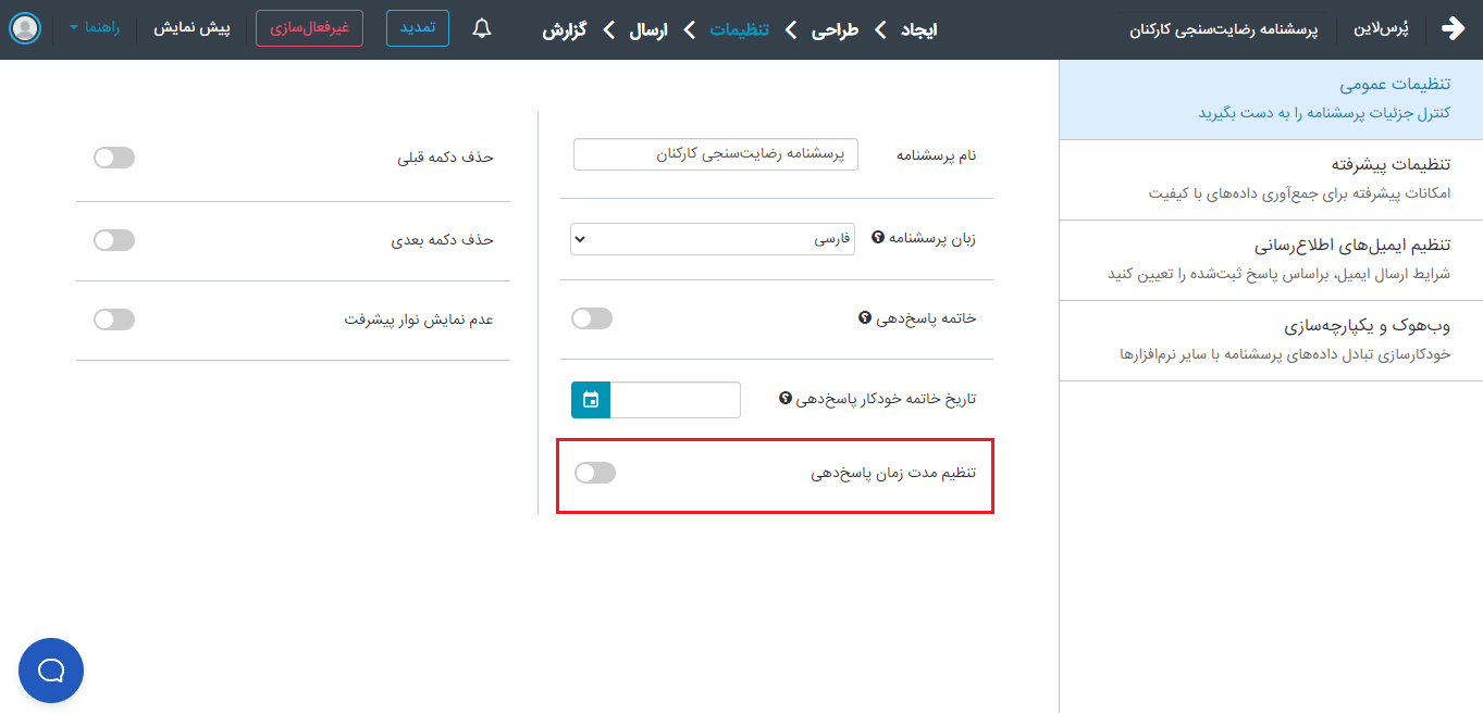 نام پرسشنامهخاتمه پاسخ‌دهیتاریخ خاتمه خودکار پاسخ‌دهیتنظیم مدت‌زمان پاسخ‌دهیحذف دکمه قبلی
