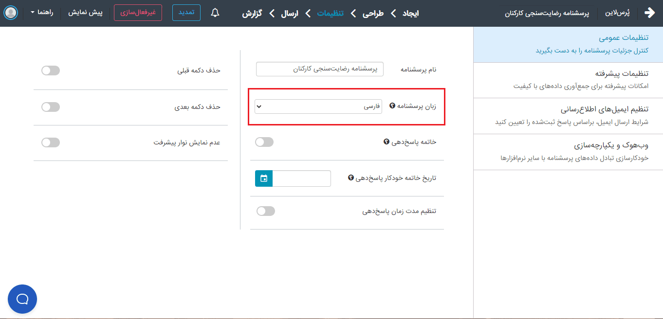 با پرس‌لاین شما می‌توانید به ۴ زبان مختلف فارسی، انگلیسی، ترکی و عربی پرسشنامه بسازید. با تغییر زبان پرسشنامه، زبان صفحه پاسخ‌دهی و پیام‌های سیستمی به زبان انتخاب‌شده تغییر می‌یابد. تغییر زبان پرسشنامه در مواردی کاربرد دارد که سوالات طراحی شده شما به یکی از این ۴ زبان نوشته شده باشد. اگر زبان انتخاب‌شده انگلیسی یا ترکی باشد سیستم حالت نوشتاری سوال و جواب‌ها را به طور اتوماتیک به حالت چپ به راست تغییر می‌دهد. یکی از ۴ زبان مورد نظر را انتخاب کنید و گزینه ذخیره در انتهای صفحه را بزنید.