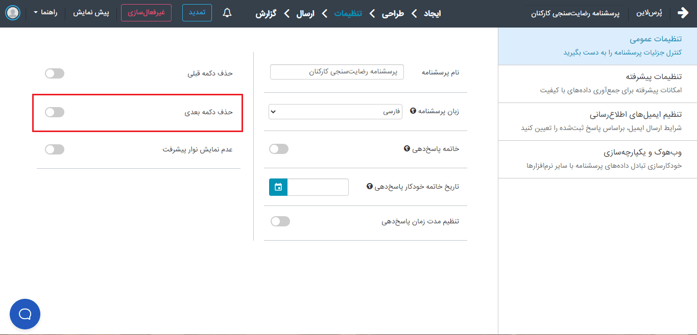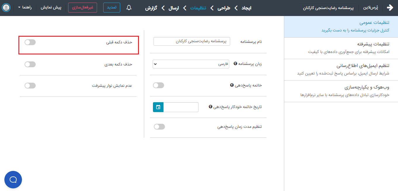 ممکن است در مواردی ترجیح شما این باشد که پاسخ‌دهنده نتواند به سوالات قبلی بازگردد و قادر به اصلاح پاسخ‌های قبلی نباشد. در این شرایط شما می‌توانید دکمه قبلی را در پرسشنامه حذف کنید. برای این کار تنها کافی است که این گزینه را فعال کرده و گزینه ذخیره در انتهای صفحه را بزنید.