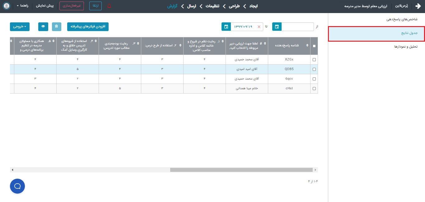 جدولی که در صفحه مشاهده میکنید جدول نتایج است که در آن میتوانید پاسخ یک به یک افراد را مشاهده کنید. برای دیدن کل پاسخهای یک فرد، نوار پایین جدول نتایج را به چپ و راست حرکت دهید.
