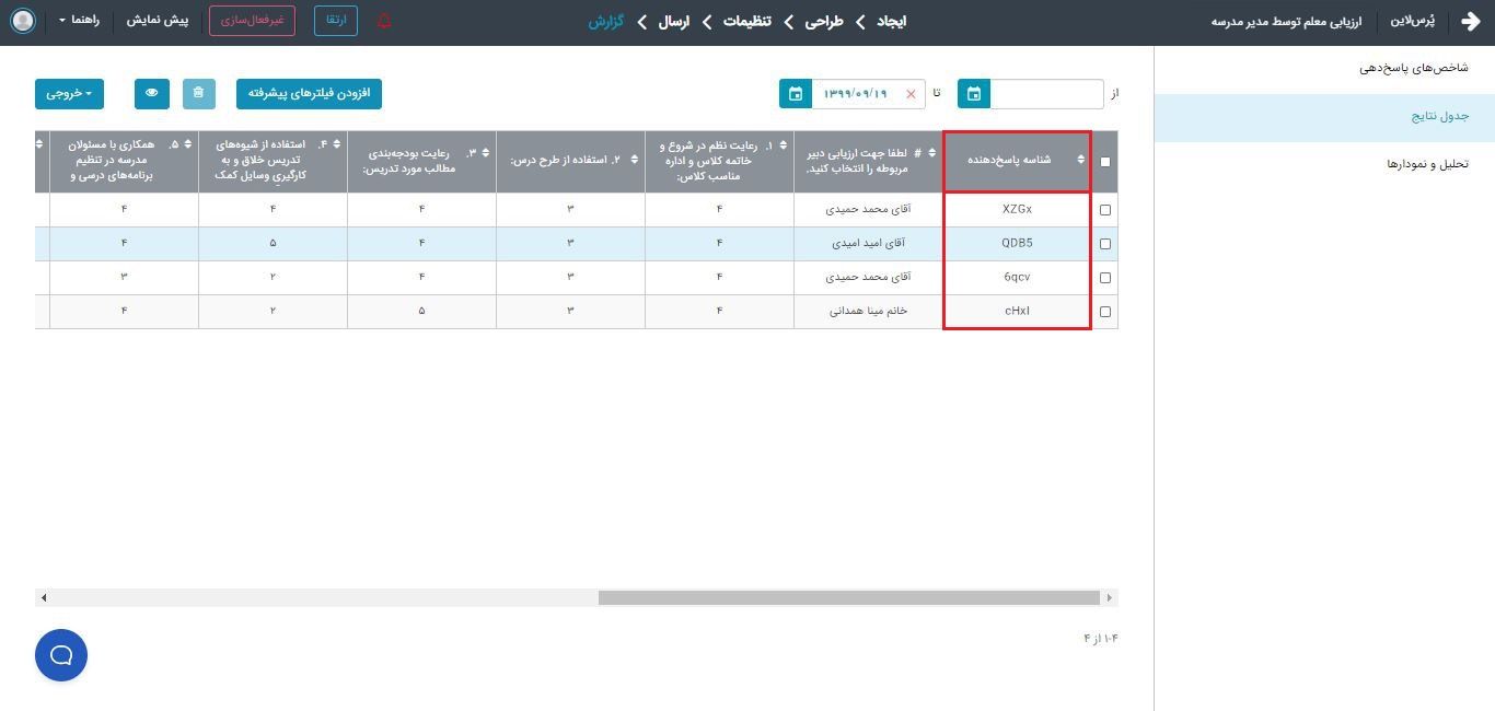 ستون اول جدول نتایج شناسه پاسخدهنده را نشان میدهد. شناسه پاسخدهنده یک کد تصادفی است که بعد از ثبت هر پاسخ، به هر پاسخدهنده تعلق میگیرد. این کد برای هر شخص متفاوت است و در شناسایی هویت پاسخدهنده نقشی ندارد. از شناسه پاسخدهنده برای دادن کدرهگیری یا پیگیری به پاسخدهنده در برخی از سناریوها میتوانید استفاده کنید.
