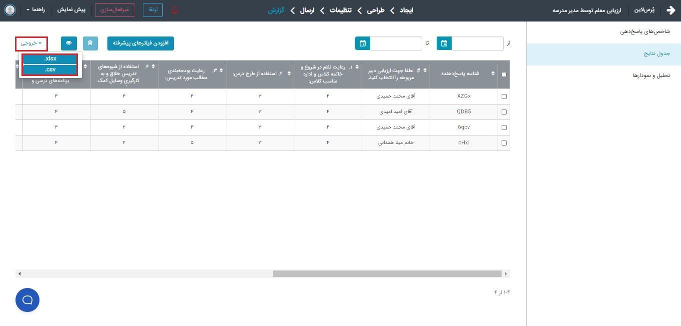 برای دسترسی به یک خروجی از کل پاسخهای ثبت شده روی پرسشنامه، میتوانید از قسمت خروجی در بالای جدول نتایج اقدام کنید. شما از این قسمت میتوانید خروجی اکسل یا CSV از کل پاسخهای دریافت روی پرسشنامه داشته باشید.