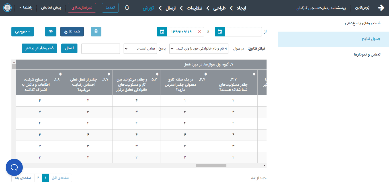 بعد از طراحی پرسشنامه و به اشتراکگذاری آن، میتوانید نتایج و پاسخهای ثبتشده روی پرسشنامه را در بخش گزارش/ جدول نتایج مشاهده کنید. در بخش جدول نتایج میتوانید پاسخهای هر فرد را به صورت جداگانه ببینید و از کل دادههای ثبتشده روی پرسشنامه خروجی اکسل یا CSV بگیرید. از آنجا که دسترسی به بخش جدول نتایج برای کاربریهای رایگان، حرفهای و سازمانی متفاوت است آنها را به صورت جداگانه شرح میدهیم.