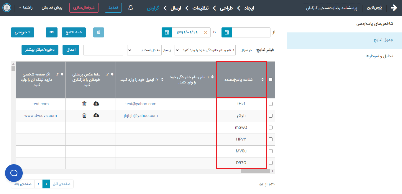 ستون اول جدول نتایج شناسه پاسخدهنده را نشان میدهد. شناسه پاسخدهنده یک کد تصادفی است که بعد از ثبت هر پاسخ، به هر پاسخدهنده تعلق میگیرد. این کد برای هر شخص متفاوت است و در شناسایی هویت پاسخدهنده نقشی ندارد. از شناسه پاسخدهنده برای دادن کد رهگیری یا پیگیری به پاسخدهنده در برخی از سناریوها میتوانید استفاده کنید.