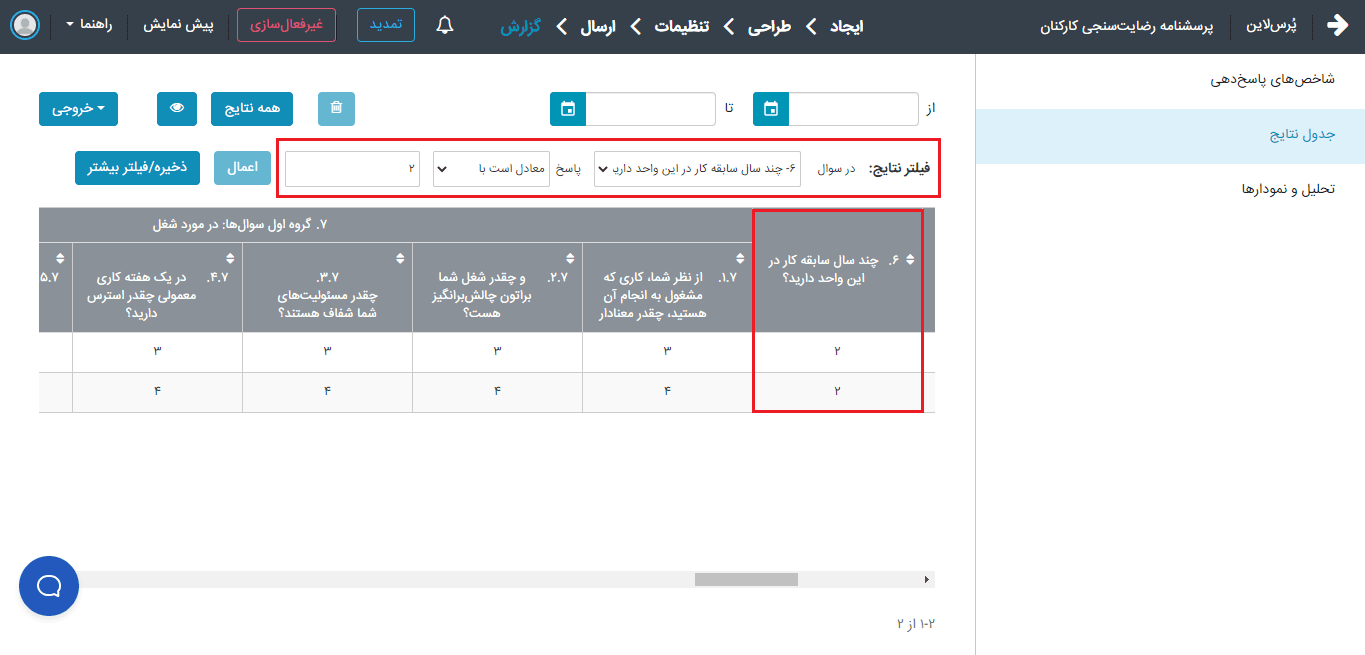 بالای جدول نتایج کادری مشخص شده تا اگر در سوال خاصی به دنبال فیلتر کردن پاسخ هستید مشخص نمایید. برای مثال اگر سوالی دارید که بازه سنی مخاطب را پرسیدهاید میتوانید در کادر سوال مشخص کنید که در سوال : «بازه سنی خود را مشخص کنید» به دنبال پاسخ: «بازه سنی ۲۰ تا ۲۵ سال» هستید که پاسخ را باید در کادر پاسخ مشخص کنید. به این ترتیب با اعمال فیلتر جدول نتایج فقط پاسخهایی را به شما نشان میدهد که بازه سنی ۲۰ تا ۲۵ سال هستند.