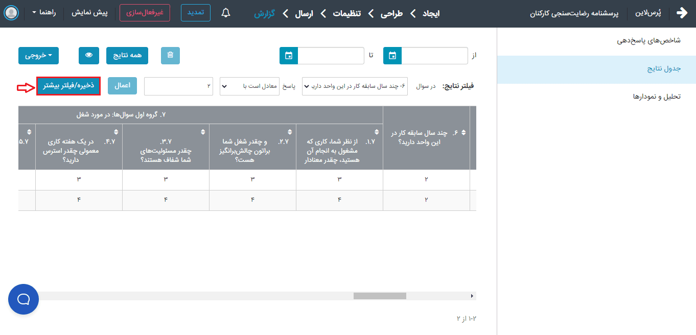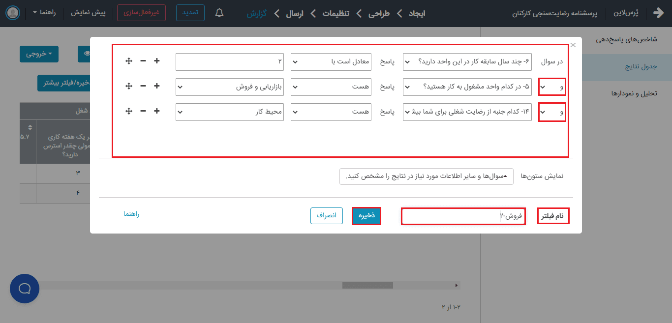 به هنگامی که شما قصد دارید یک یا چند سوال و جواب را با شرطهای مختلف کنار هم ببینید باید از فیلترهای پیشرفته استفاده کنید. مثلا اگر قصد داشته باشید پاسخهایی را مشاهده کنید که هم شرایط سنی ۲۰ تا ۲۵ سال را داشته باشند و هم مجرد باشند لازم است به این صورت عمل کنید: