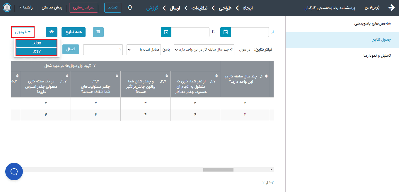 برای دسترسی به یک خروجی از کل پاسخهای ثبتشده روی پرسشنامه، میتوانید از قسمت خروجی در بالای جدول نتایج اقدام کنید. شما از این قسمت میتوانید خروجی اکسل یا CSV از کل پاسخهای دریافتشده روی پرسشنامه داشته باشید.