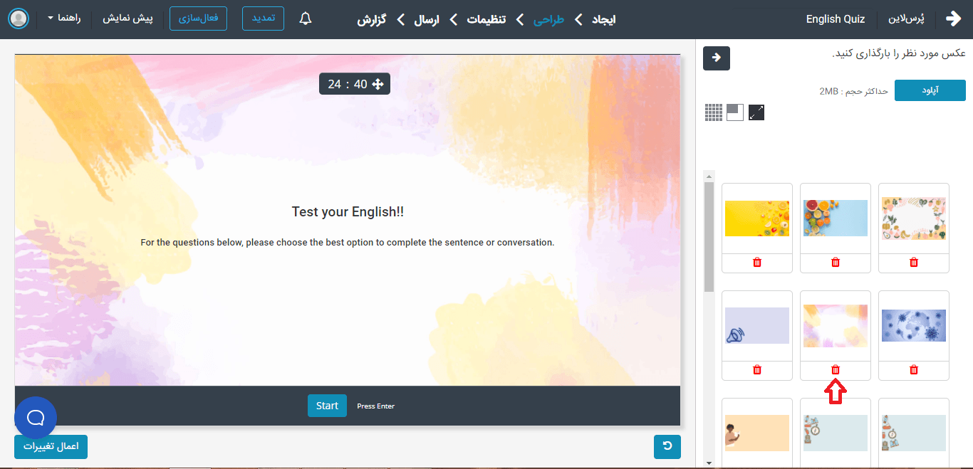 ۳.زیرعکس پسزمینه یا لوگوی انتخابشده برای پرسشنامه یک علامت سطل زباله است، روی آن کلیک کنید و آن را حذف کنید.