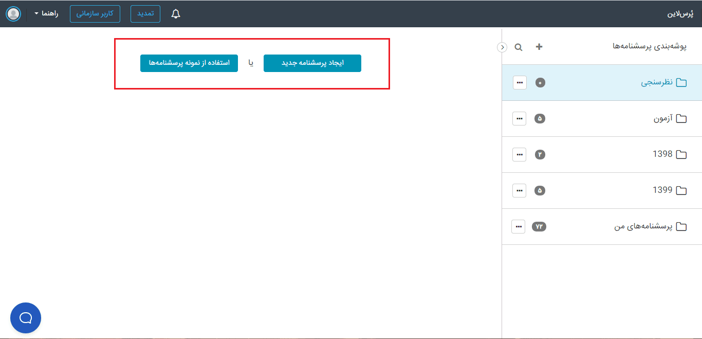 ۱.برای ساخت یک پرسشنامه جدید به صفحه پرسشنامه‌های من بروید و گزینه ایجاد پرسشنامه جدید را انتخاب کنید.