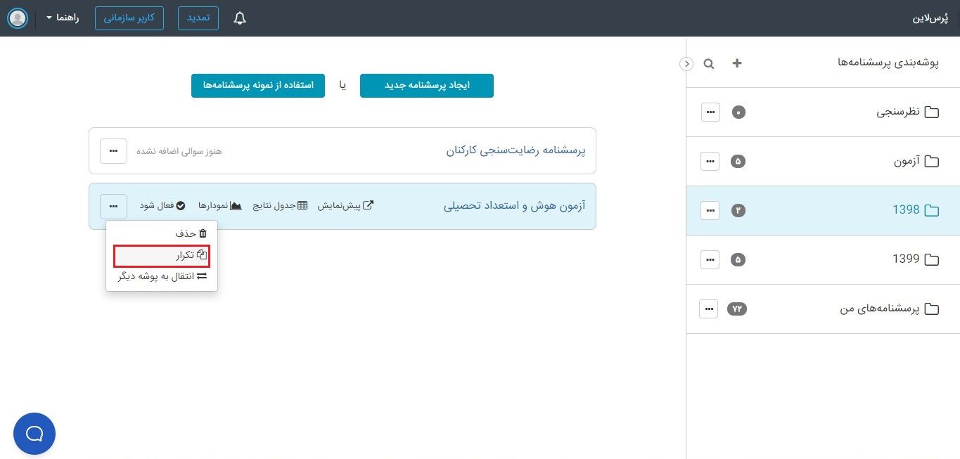 اگر سناریوی پرسشنامه‌ای که قصد ایجاد آن را دارید مشابه پرسشنامه‌های قبلی موجود در حساب کاربری‌تان است می‌توانید پرسشنامه قبلی را کپی کنید و تغییرات را روی آن ایجاد کنید. برای این کار در صفحه پرسشنامه‌های من، موس خود را روی سه نقطه روبروی نام پرسشنامه قرار دهید و گزینه تکرار را انتخاب کنید. در این مرحله می‌توانید تغییرات خود را روی نسخه جدید پرسشنامه کپی‌شده اعمال کنید.