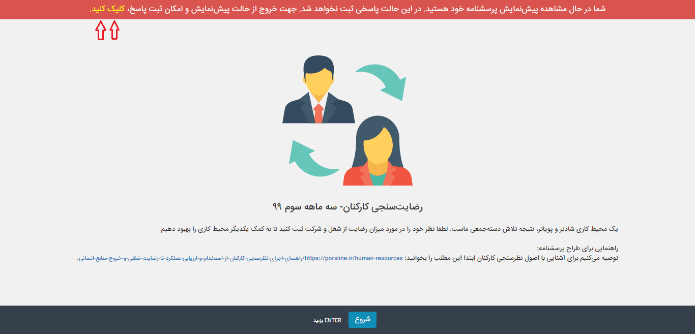 توجه کنید که در حالت پیش‌نمایش با توجه به پیامی که در بالای صفحه ظاهر می‌شود هیچ جوابی ثبت نمی‌شود. برای ثبت جواب باید پرسشنامه را از حالت پیش‌نمایش خارج کنید.